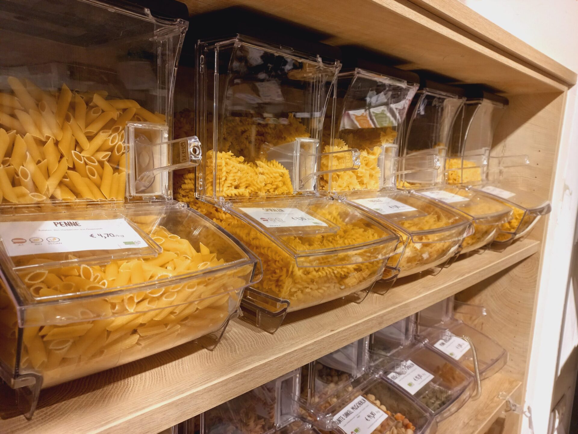Wir führen viele Lebensmittel lose, andere in Pfandbehältnissen. Nimm deine eigenen Pfandgläser mit und befülle sie an unseren Spendern im Shop!